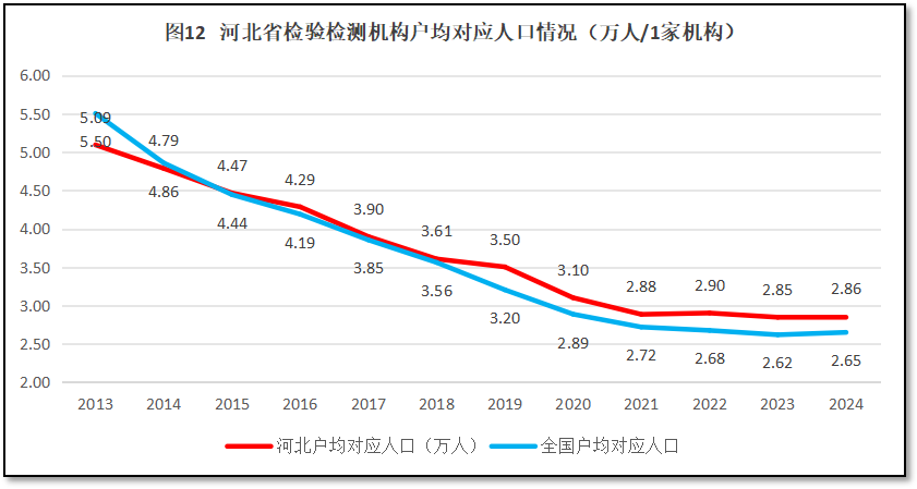 再来看河北地区检验检测机构户均对应服务的人口情况。2024年末,河北省常住人口7378万人,检验检测机构户均服务人口2.86万人,比全国平均数2.65万人高出2100人,排名全国第11位,排名也比2023年度提升了1名。从这一数据来看,相对于河北省较大的人口数量来说,当地的检验检测机构数量并不算特别多。过去12年,河北省检验检测机构户均对应的人口数量与全国的情况进行比较,如图12所示。