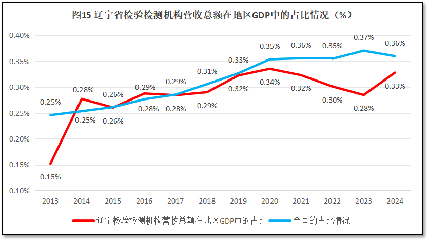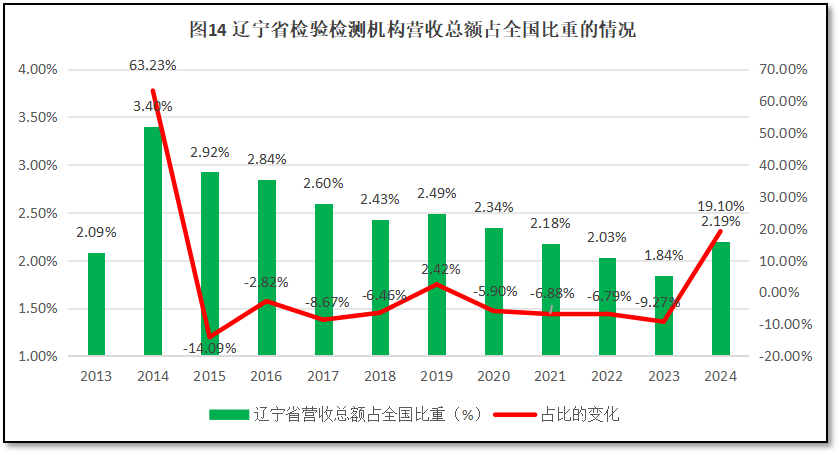 由图14可见,辽宁省检验检测机构营收总额在全国检验检测行业营收总额中的比重在2014年达到3.4%的峰值后,就一路走低,逐年下降。到2023年占比仅有1.84%,是历年来的最低点。2024年有所反弹,回升到2.19%。从增长率曲线来看,刨除2014年异常数据之外,在多数年份均为负增长,仅在2019年出现2.42%、2024年出现19.1%的两次正增长。这一曲线表明,辽宁省检验检测行业由于发展缓慢,营收不足,在全国的地位逐年下降,但这一下降势头在2024年有所缓解。