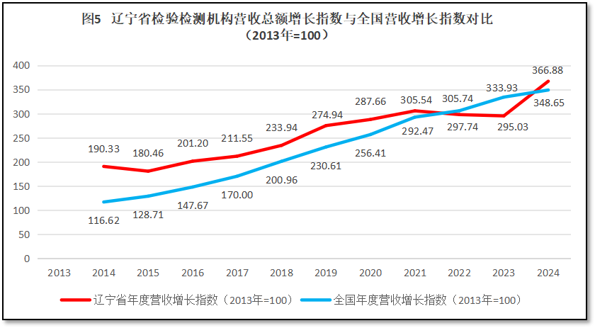 由图5可见,在2021年之前,辽宁省检验检测机构营收总额增长指数高于全国平均数,但曲线逐步与全国平均线接近,从2022年到2023年,辽宁省的曲线低于全国平均线,这也是各省极少出现的情况。2024年后,辽宁省的曲线出现反弹,再次超越全国平均数,但超出不多。总的来看,辽宁省检验检测行业发展质量一般,一度没有跑赢全行业增长指数曲线,2024年度虽然出现较好的发展势头,但这一势头是否可以持续,对辽宁省检验检测行业未来的发展极为重要。如果能保持住这一发展势头,辽宁省检验检测行业有望进一步提升在全国的地位,重铸辉煌。